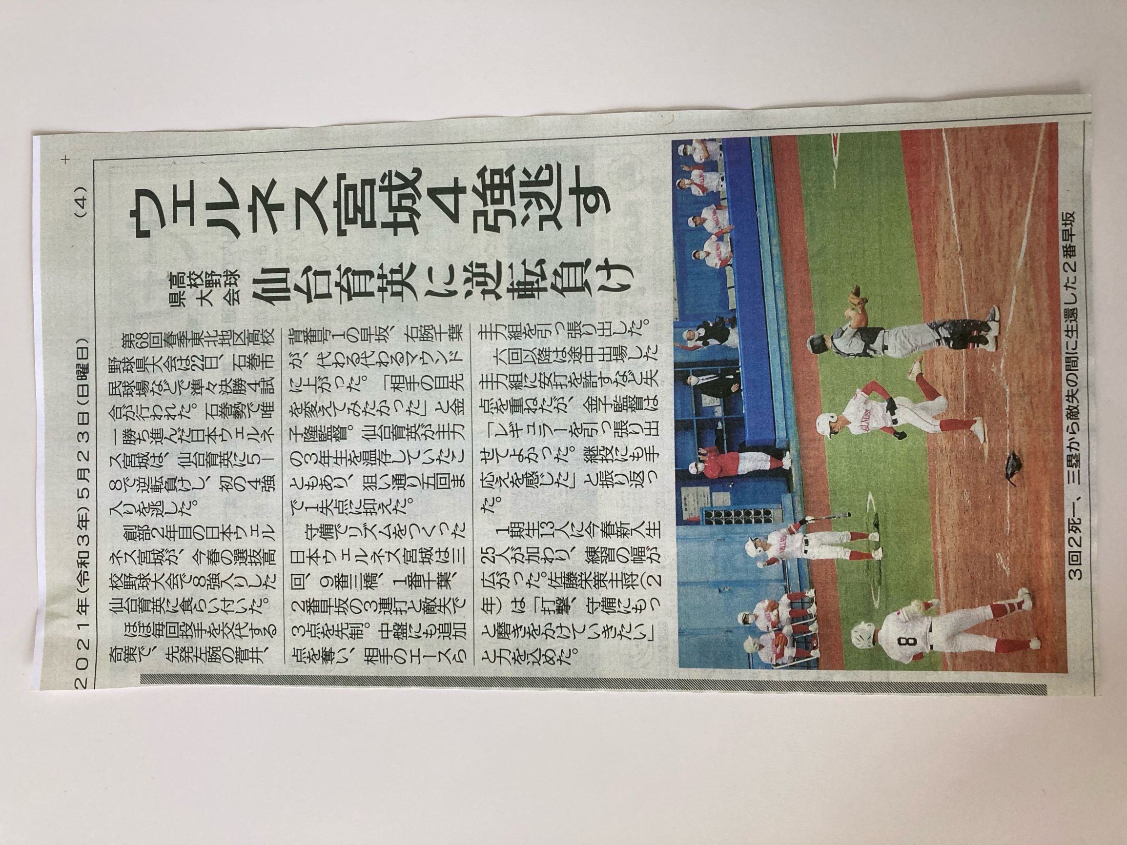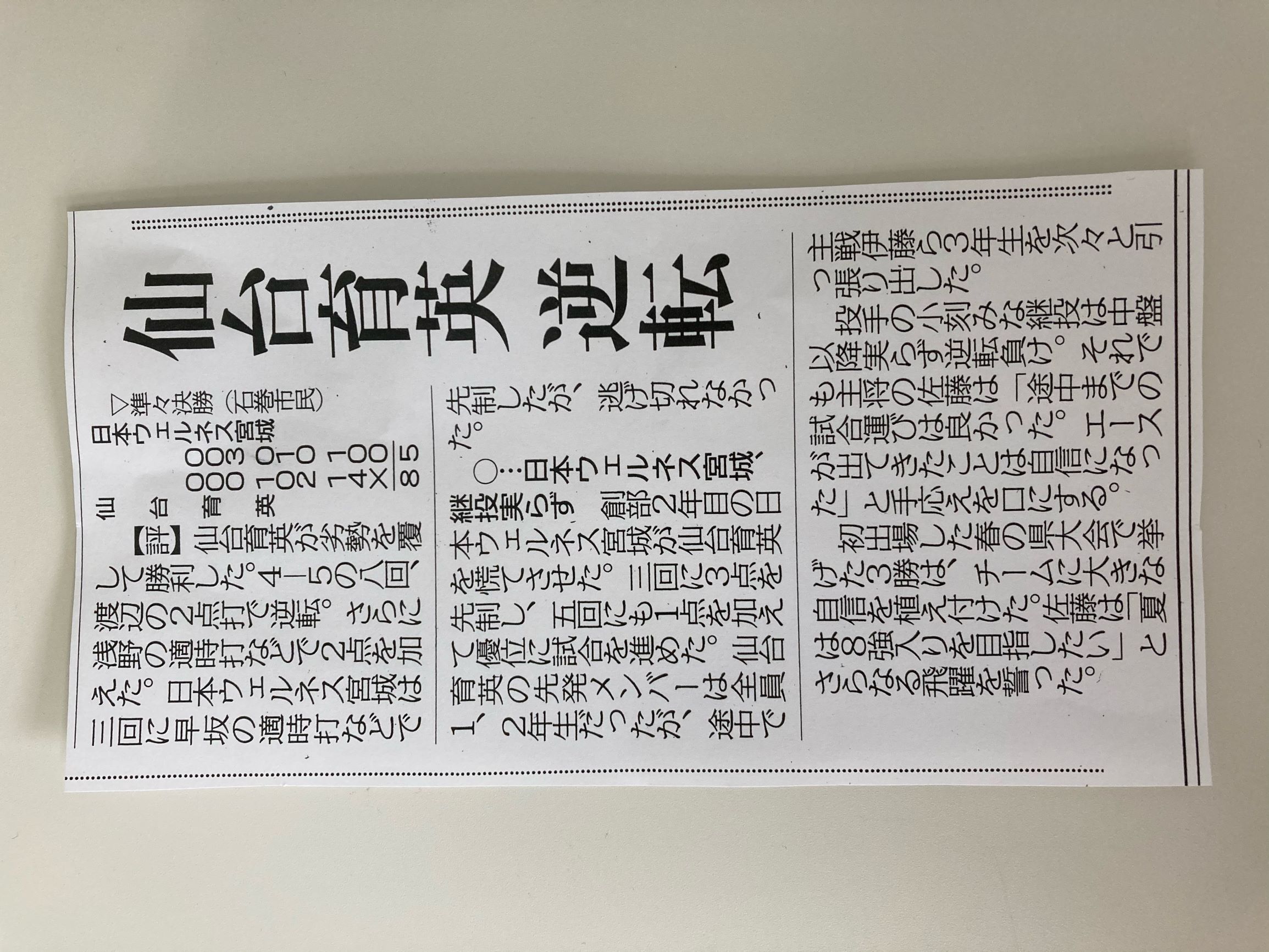 【野球部】準々決勝、大健闘! 5月22日(土)、石巻市民球場で高校野球県大会準々決勝が行われ、仙台育英高校を相手に8対5と大健闘をしました。惜しくも準決勝には進めませんでしたが、終始堂々としたプレーを見せてくれました。熱い応援をどうもありがとうございました。 5月23日石巻かほく 5月23日河北新報 ◀ 前の記事 | 2021年の記事 | 次の記事 ▶