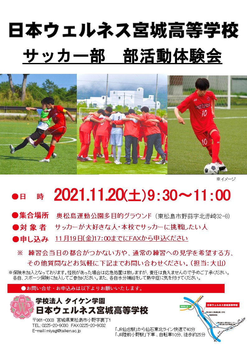 【サッカー部】部活動体験会のお知らせ サッカー部の今年度最後の部活動体験会を11月20日(土)に行います。毎回たくさんの中学生の皆さんにお越しいただきありがとうございます。今年度の最後の体験会、ぜひ多くの中学生の皆さんのお越しをお待ちしております。 ◀ 前の記事 | 2021年の記事 | 次の記事 ▶