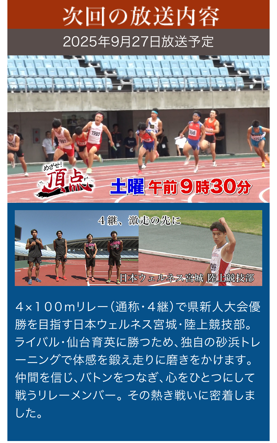 9月27日(土) 午前9時30分から、東日本放送(KHB)の「めざせ!頂点」に、本校の陸上競技部が出演します。