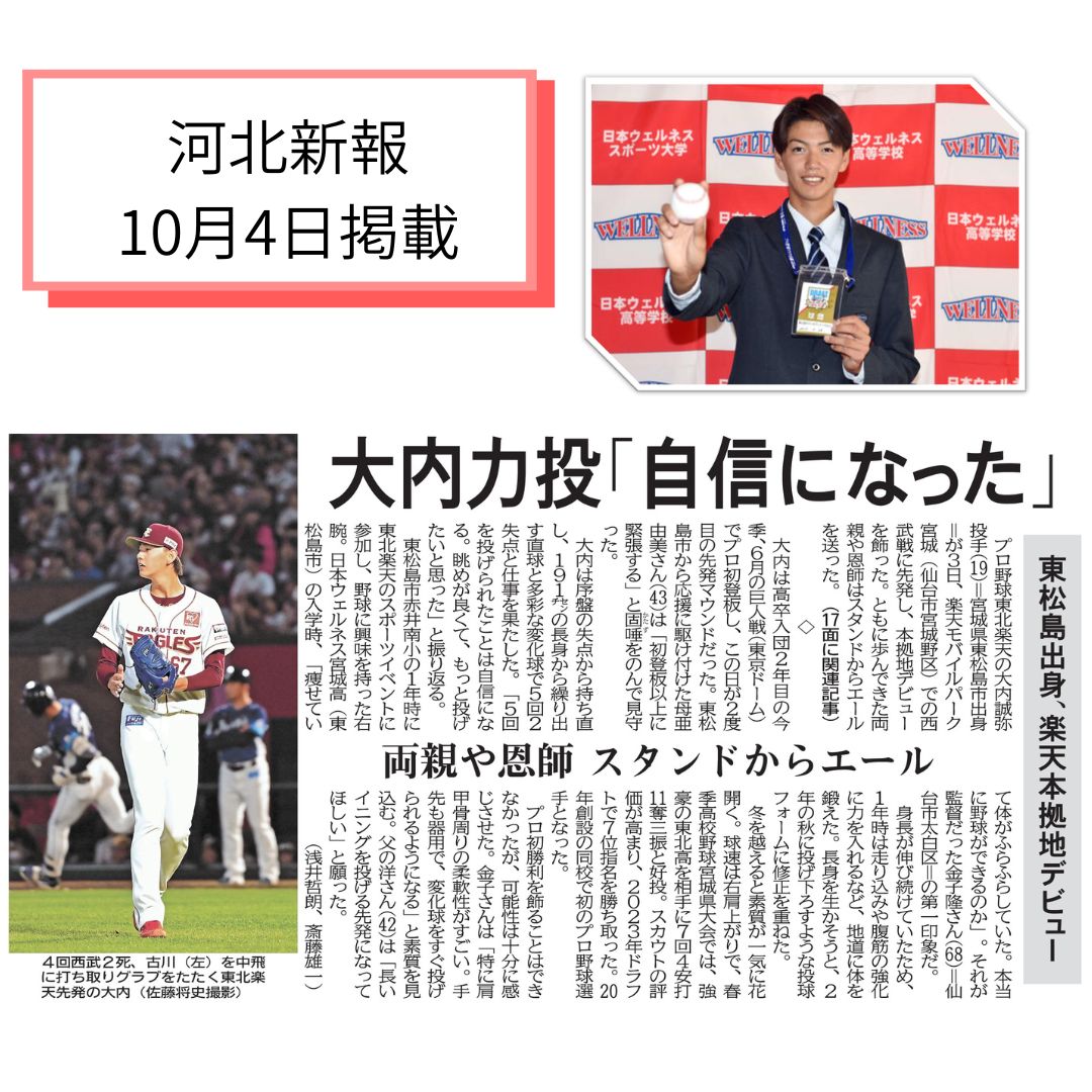 卒業生 大内誠弥選手が河北新報に掲載されました⚾ 2024年3月に宮城校を卒業し、東北楽天ゴールデンイーグルスに入団した『大内誠弥選手』が、10月3日に行われた楽天モバイルパーク宮城での西武戦で先発出場しました。 この試合での活躍が河北新報に掲載されましたので、ぜひご覧ください⚾ ◀ 前の記事 | 2025年の記事 | 次の記事 ▶