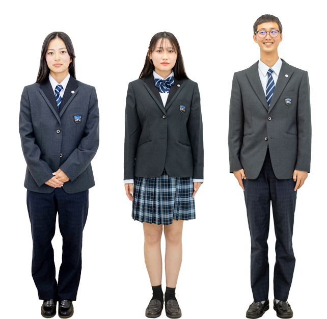 女子のスカートは大きめのチェック柄、ブレザーの襟は別布を使用し、可愛らしさの中にも大人の雰囲気を感じるデザイン。