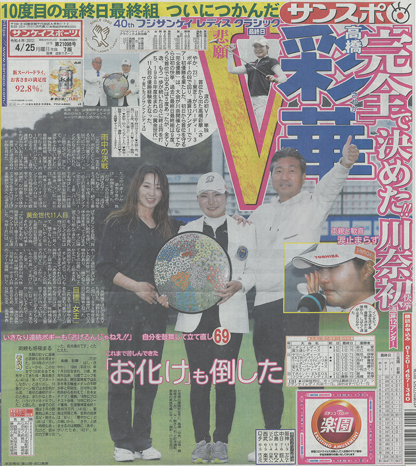 4月24日(日)、「フジサンケイレディス クラシック」が行われ、日本ウェルネススポーツ大学3年高橋彩華さん(東芝)が悲願の初優勝を飾りました。